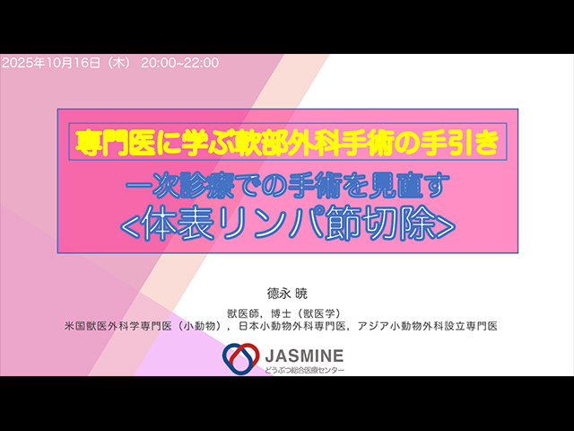 今回は、腫瘍診療に不可欠なリンパ節生検・切除について、体表から体腔内まで幅広く実践的に解説します。下顎・内側咽頭後・浅頚・腋窩・鼠径・膝窩リンパ節を中心に、アプローチの実際、避けるべき危険領域、手術を成功させるコツを豊富な症例動画とともに紹介。明日の手術が変わる、実践力を磨くための必見のセミナーです。若手から経験豊富な獣医師まで幅広くおすすめの内容です。