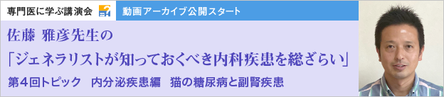 | セミナー名 | 佐藤 雅彦先生の ジェネラリストが知っておくべき内科疾患を総ざらい 内分泌疾患編 猫の糖尿病と副腎疾患 |
