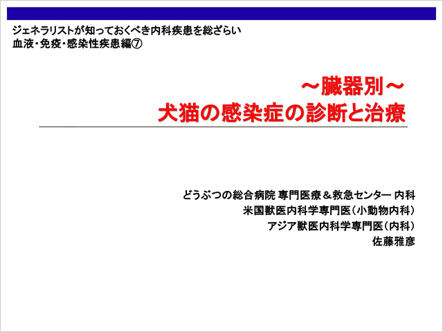 セミナー名 | 佐藤 雅彦先生の ジェネラリストが知っておくべき内科疾患を総ざらい 第22回 血液・免疫・感染疾患編 〜臓器別〜犬猫の感染症の診断と治療 |